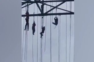 Unos obreros quedaron suspendidos a más de 100 metros de altura, colgados…