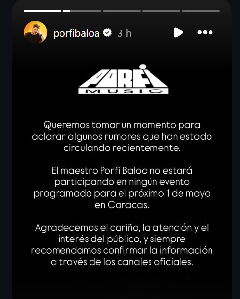 «Queremos tomar un momento para aclarar algunos rumores que han estado circulando recientemente. El maestro Porfi Baloa no estará participando en ningún evento programado para el próximo 1 de mayo en Caracas», indicó el equipo en un comunicado divulgado en las redes sociales.