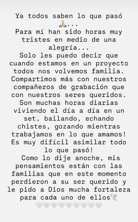 «Ya todos saben lo que pasó… Para mí han sido horas muy tristes en medio de una alegría… Solo les puedo decir que cuando estamos en un proyecto todos nos volvemos familia. Compartimos más con nuestros compañeros de grabación que con nuestros seres queridos. Son muchas horas diarias viviendo el día a día en un set, bailando, echando chistes, gozando mientras trabajamos en lo que amamos», reseñó.