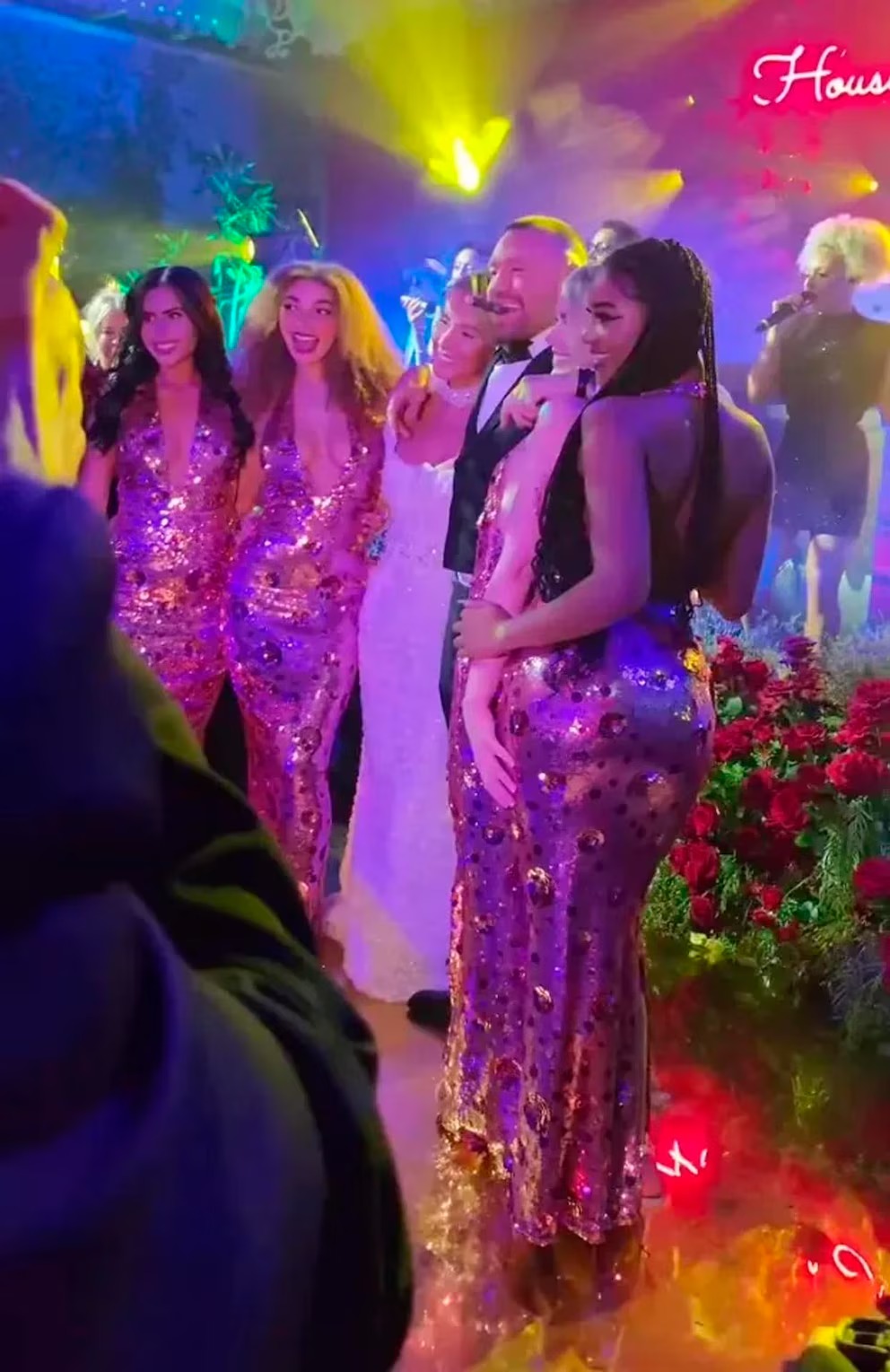 En los videos y fotos que se han divulgado en redes sociales aparecen relajados, compartiendo con los invitados y posando para las cámaras junto a mujeres con vestidos de lentejuelas.