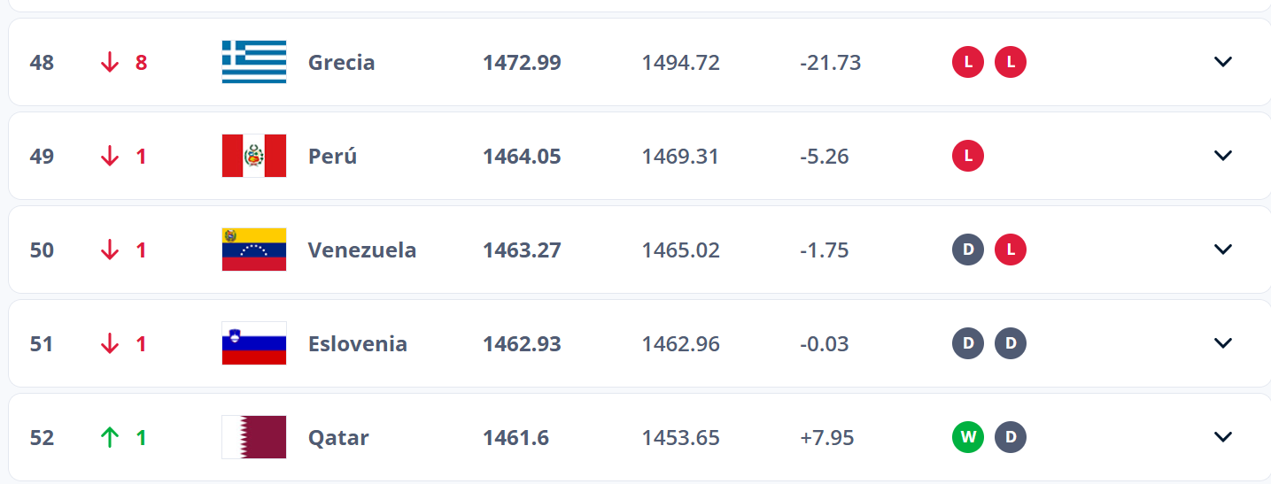 De acuerdo a la tabla publicada por el máximo organismo del fútbol, Venezuela pasó de 1465,02 a 1463,25 puntos.