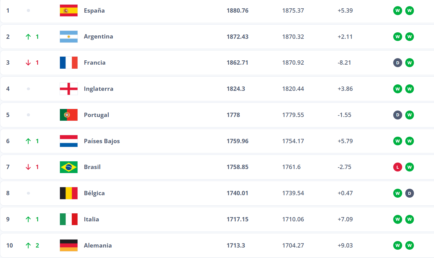 Además, Italia subió a la novena posición. Por último, el top 10 publicado por la FIFA lo completa la selección de Alemania que subió dos casillas y sacó a Croacia de las primeras posiciones.