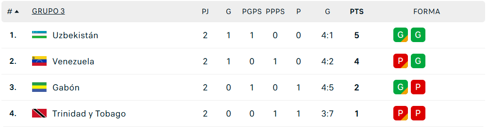 Por lo cual, tras este resultado, Venezuela finaliza su paso por este torneo en la segunda posición, por delante de Gabón y Trinidad y Tobago.