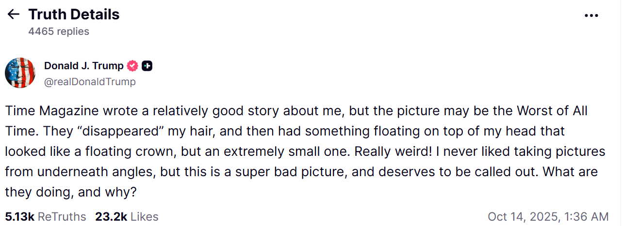 El presidente de los Estados Unidos, Donald Trump, se quejó este martes de la foto que la revista Time publicó en una entrevista sobre los acuerdos de paz en Gaza.