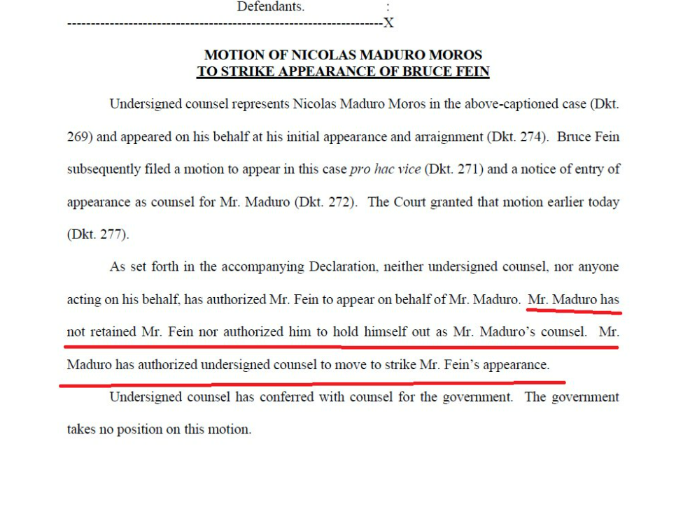Barry Pollack, abogado de Nicolás Maduro, afirmó que el jurista Bruce Fein no tiene autorización de su cliente ni de su equipo legal para incorporarse al caso que se procesa por la justicia de los Estados Unidos. Por ello, solicitó al juez su exclusión del proceso, petición que fue finalmente aprobada.