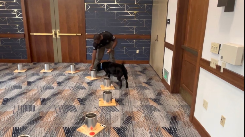 Carolina y Belle, perros de la ATF, realizan una demostración para ABC News sobre sus capacidades para detectar bombas. / Cortesía: ABC News