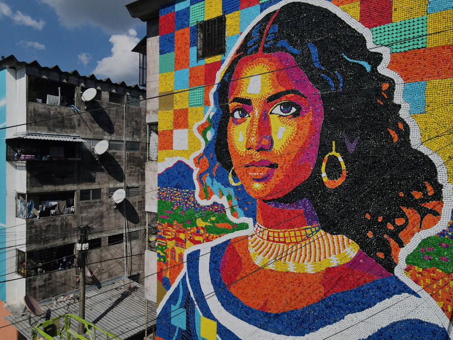 (EFE).- Inspirado en «La Gioconda», también conocida como «La Mona Lisa», una de los obras más famosas del mundo del italiano Leonardo da Vinci, el artista venezolano Óscar Olivares elaboró un mural con más de 100.000 tapas plásticas de colores recicladas en una zona populosa de El Salvador como un homenaje a la mujer salvadoreña y latinoamericana.