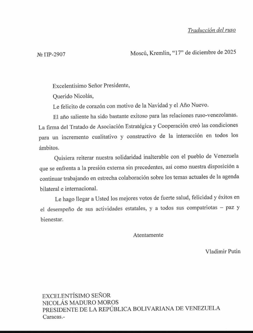 El presidente de Rusia, Vladimir Putin, envió una carta a Nicolás Maduro con motivo de las fiestas decembrinas y en respaldo a su gestión.