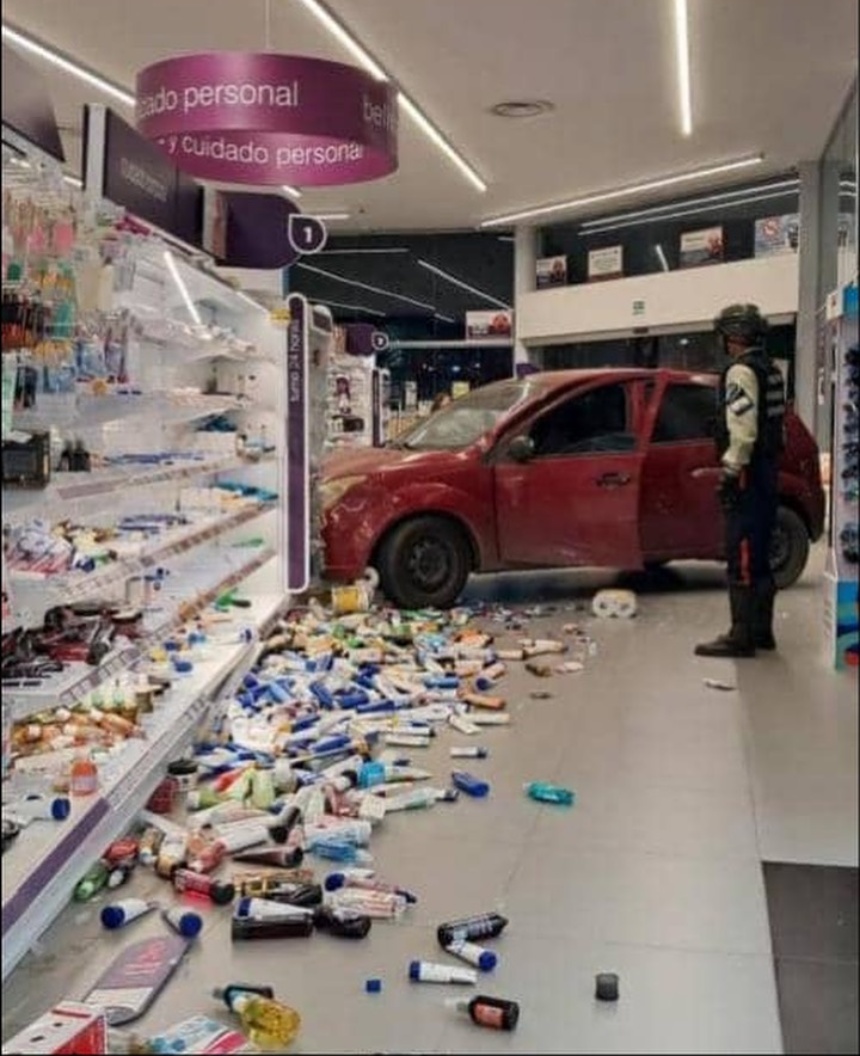 En redes sociales se viralizó una foto en la que se aprecia un carro Fiesta rojo en medio del local. Todo parece indicar que impactó contra uno de los anaqueles, puesto que decenas de productos están en el suelo.