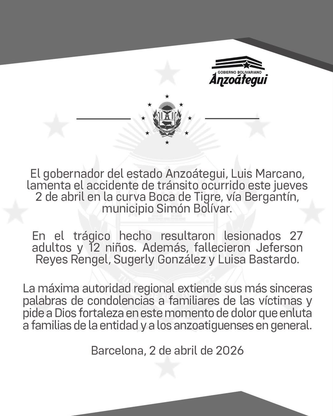 La Gobernación de Anzoátegui anunció que los organismos de seguridad y rescate se fueron desplegados en la zona del accidente. El gobernador Luis Marcano, por su parte, envió condolencias a los familiares de las víctimas.