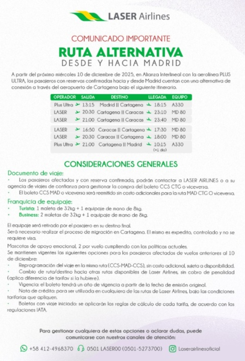 «Laser Airlines informa a sus clientes y aliados comerciales que, debido a la imposibilidad operativa de mantener los vuelos directos entre España y Venezuela, hemos diseñado una alternativa de conexión a través del aeropuerto de Cartagena», apuntó.