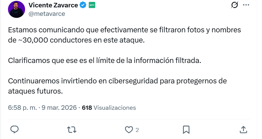«Estamos comunicando que efectivamente se filtraron fotos y nombres de 30.000 conductores en este ataque. Clarificamos que ese es el límite de la información filtrada», dijo en un mensaje divulgado en sus redes sociales.