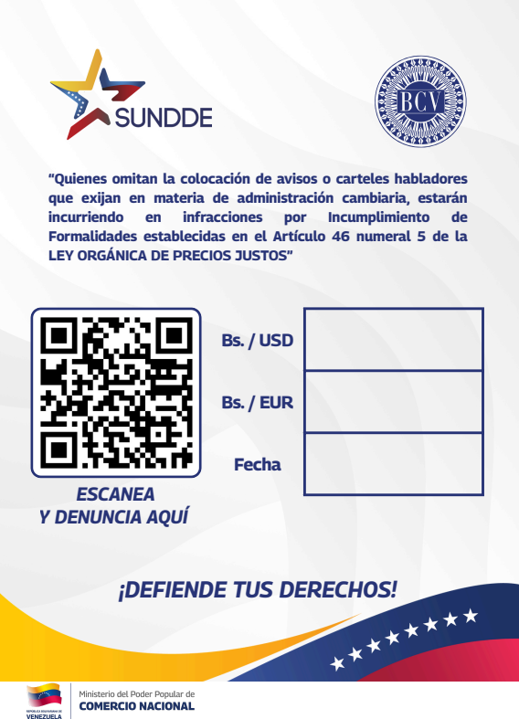 La Superintendencia Nacional para la Defensa de los Derechos Socioeconómicos (Sundde) dio a conocer el nuevo formato para divulgar la tasa oficial del Banco Central de Venezuela (BCV) y que debe ser colocado en los establecimientos comerciales del país.