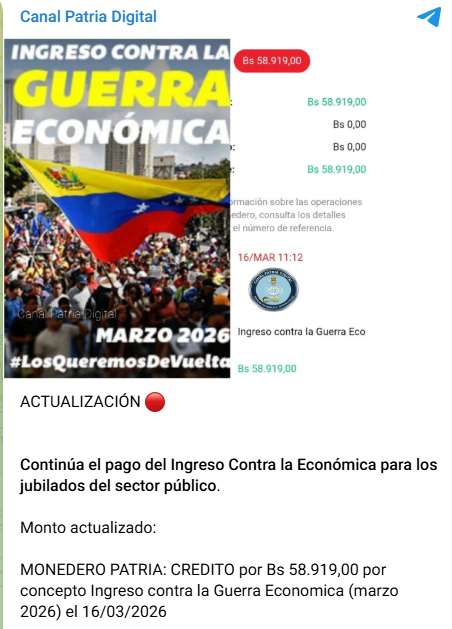 El Sistema Patria comenzó a entregar este lunes, 16 de marzo, el bono «Ingreso Contra la Guerra Económica», cuyos beneficiarios son los jubilados de la administración pública, por un monto de 58.919,00 bolívares.