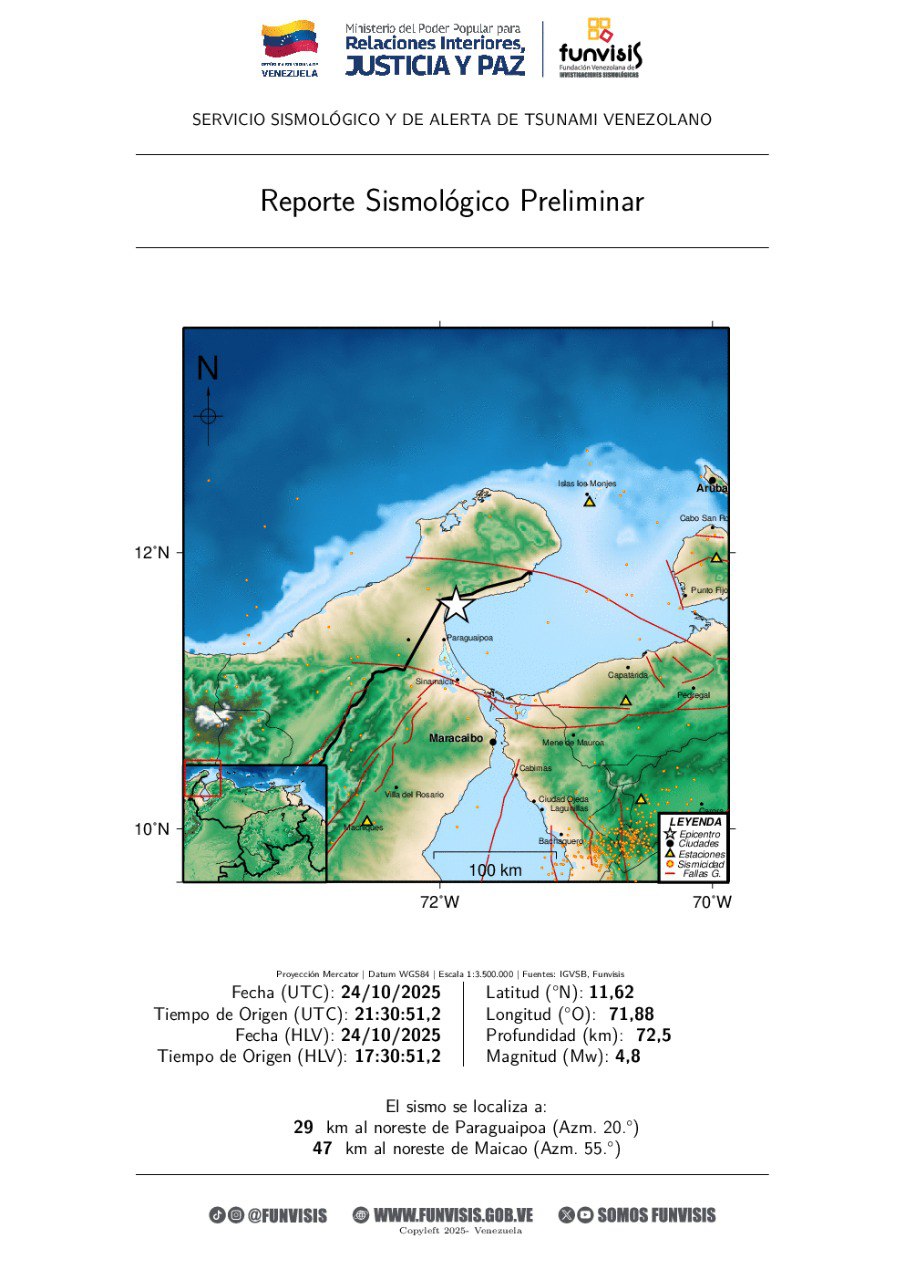 Funvisis precisó que el sismo tuvo una magnitud de 4.8 grados, con una profundidad de 72,5 kilómetros. El epicentro estuvo ubicado a 29 kilómetros de Paraguaipoa, en las costas zulianas hacia el Golfo de Venezuela.