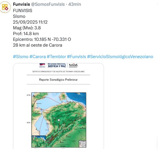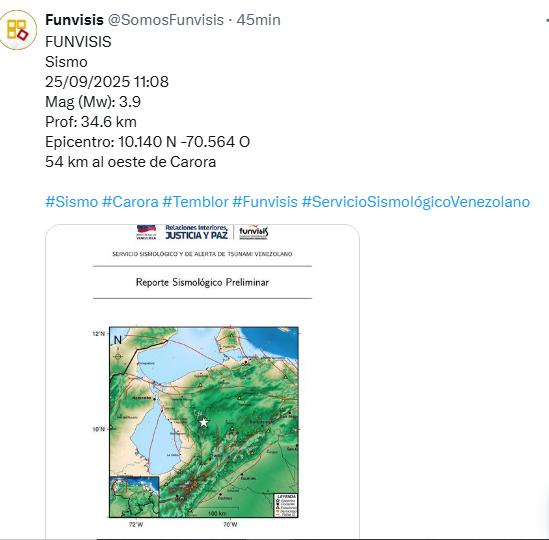 Según el reporte, a las 11:08 a.m. se registró uno de magnitud 3.9. El mismo tuvo una profundidad de 34.6 km y el epicentro fue a 54 kilómetros al oeste de Carora.