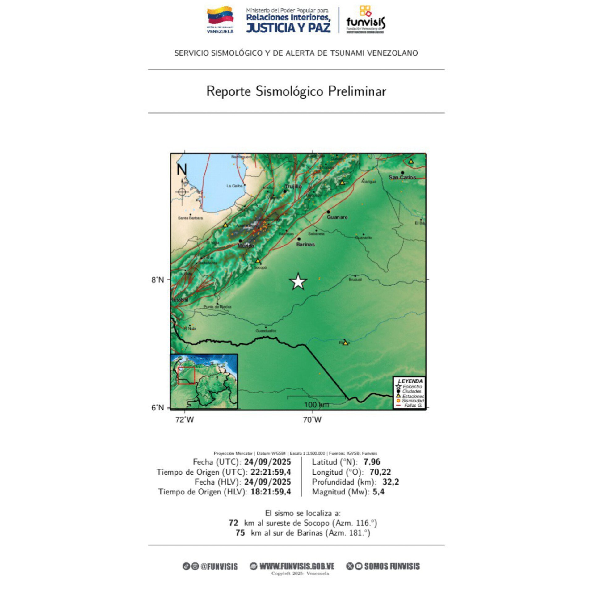 La Fundación Venezolana de Investigaciones Sismológicas (Funvisis) informó de un primer temblor a las 5:50 de la tarde a 26 kilómetros al sureste de Bachaquero, en el estado Zulia, con una magnitud de 3,9.