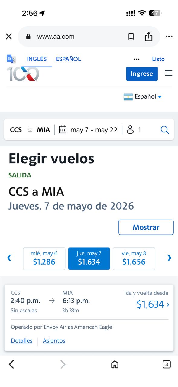 Los vuelos de American Airlines en la ruta Caracas-Miami, ida y vuelta, estarían sobre los 1.600 dólares, de acuerdo a los precios publicados en la página web de la aerolínea, que espera retomar sus vuelos directos diarios entre ambos destinos a partir del 30 de abril de 2026.