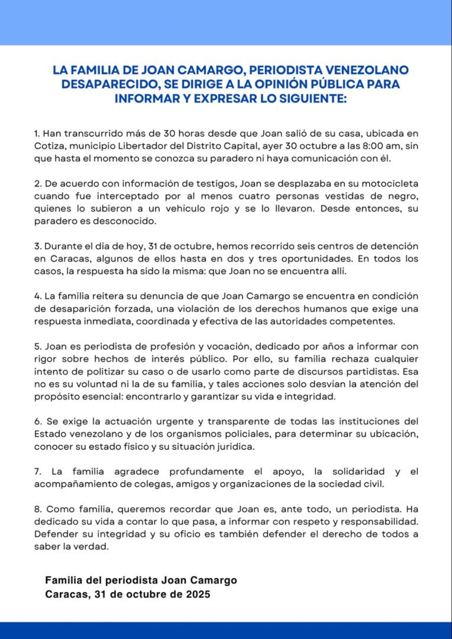 «Durante el día de hoy, 31 de octubre, hemos recorrido seis centros de detención en Caracas, algunos de ellos hasta en dos o tres oportunidades. En todos los casos, la respuesta ha sido la misma: que Joan no se encuentra allí», apuntó la familia.
