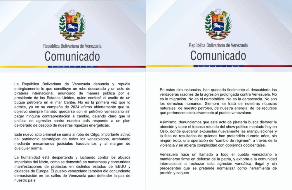 Nicolás Maduro y otros voceros gubernamentales han condenado la entrega del Premio Nobel de la Paz a la opositora María Corina Machado. El comunicado consideró que hay una conexión entre la incautación del buque y este reconocimiento.