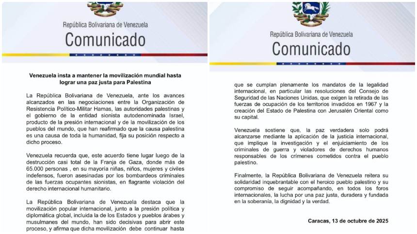 «Venezuela recuerda que, este acuerdo tiene lugar luego de la destrucción casi total de la Franja de Gaza. Más de 65.000 personas, en su mayoría niñas, niños, mujeres y civiles indefensos, fueron asesinadas por los bombardeos criminales de las fuerzas ocupantes sionistas, en flagrante violación del derecho internacional humanitario», dice el texto publicado por la Cancillería.