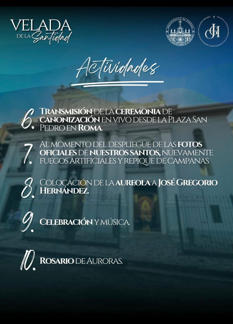 El próximo sábado 19 de octubre, el templo será el epicentro de la fe nacional al acoger la «Velada de la Santidad». Este es un evento extraordinario para transmitir en pantalla gigante y en directo desde Roma la elevación a los altares de los dos primeros santos venezolanos. San José Gregorio Hernández y Santa Carmen Rendiles.